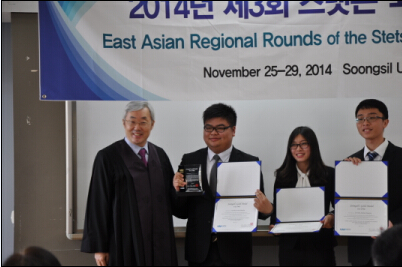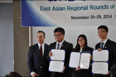 大赛分书面陈述和口头辩论两部分,我校于2014年10月起开始组队准备,于2014年11月按时提交了书面陈述,经过评选后取得赴韩国参与口头辩论的资格。在预赛中,我校代表队分别对阵韩国韩东大学(Handong University)、崇实大学(Soongsil University)以及蒙古国伊赫扎撒克国际大学(Ikh Zasag International University)代表队,以三场全胜的成绩顺利进入半决赛。在半决赛中我校力克台湾国立大学代表队,顺利晋级决赛。在决赛中,我校代表队与加拿大谢布克大学(University of Sherbrooke)代表队展开激烈交锋,最终以优秀的表现胜出并摘得桂冠。队员们在比赛中表现出的扎实丰富的国际法知识、标准流利的英语表达、严谨缜密的法律思维和从容不迫的临场应变,获得了法官们的一致好评。