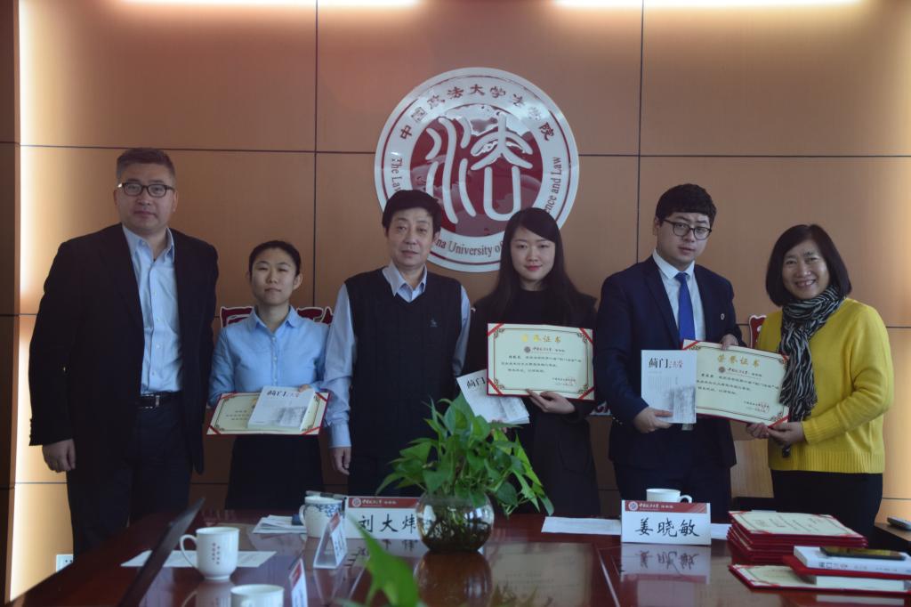 最后刘大炜、陈维厚、姜晓敏为获奖学生颁发获奖证书和《蓟门法学》论文集,并与获奖同学合影留念。