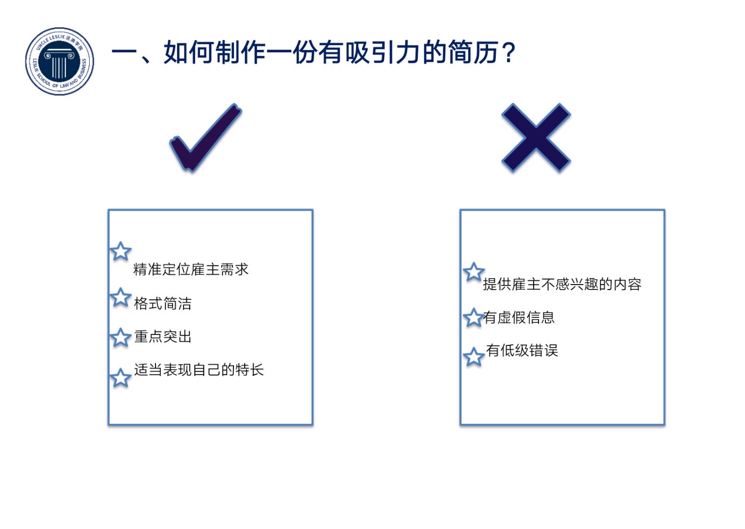 本次实战课程从“如何制作一份有吸引力的简历”和“面试应如何准备”两个方面进行。