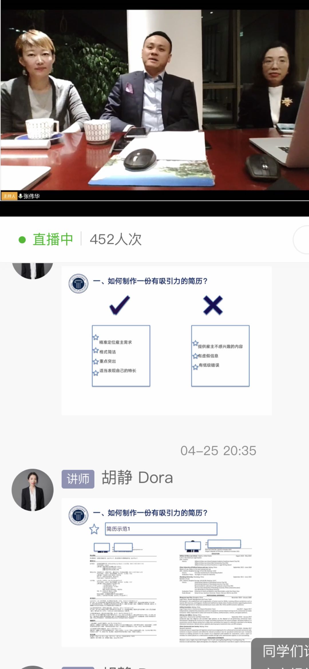 就“如何制作一份有吸引力的简历”,张伟华指出,制作简历要做到简洁,重点突出,符合面试职位的要求;胡静指出,简历要精准考虑到职位的要求,投其所好,要有针对性;陈苾认为,在简历中正确量化自己的成绩,才能使简历脱颖而出。专家们向同学们分享了简历制作的正面和反面案例,提出简历要精确定位雇主需求、格式简洁、重点突出和适当表现自己的特长,不要出现雇主不感兴趣的内容、虚假信息和低级错误。