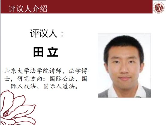 在王佳副教授对孟誉双博士的论文作出点评后,山东大学新葡萄官网amg的田立老师对文章进行评议。田立老师从军事斗争法理依据的角度对“禁止使用武力原则”的研究价值给予了高度认可。田老师建议,在目前我国台海局势高度紧张的背景下,加强对“禁止使用武力原则”的研究有助于为我国的国际行动寻找重要的合法依据。此外,田老师认为孟博士的论文中缺少对“禁止使用武力原则”中文用语瑕疵的论证,建议孟博士加强对这一问题的证成。