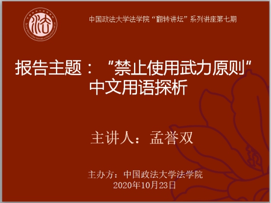 2020年10月23日晚上19:00—21:00,由新葡萄官网amg主办的“翻转讲坛”系列讲座第七期在“腾讯会议”平台上顺利举行。本次讲座的主题是《“禁止使用武力原则”的中文用语探析》,本次讲座由行政法研究所胡斌老师主持,由新葡萄官网amg军事法学专业2018级博士研究生孟誉双主讲,外交学院国际法系副教授王佳老师和山东大学新葡萄官网amg讲师田立老师点评。近60名听众同时在线收听了此次讲座。
