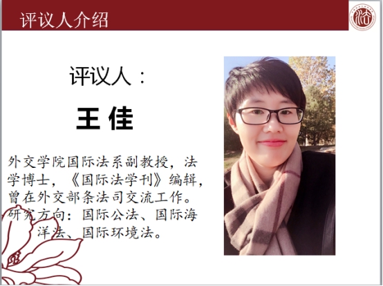 报告结束后,由外交学院国际法系副教授王佳老师对孟博士的文章进行点评。王佳老师首先肯定了孟博士论文选题的问题意识,对论文的学术价值做出了高度评价。随后王佳老师提出了孟博士的论文在文字表述上不够法律化和专业化,并对孟博士文章的修改提出了积极有益的建议。此外,王佳老师还以期刊编辑的身份向孟博士和所有参加讲座的同学提出了宝贵的论文选题和写作建议,王佳老师建议同学们关注学术界研究的热点问题,避免过于曲高和寡的选题。这样写出的论文会有更高的引用率,更容易获得期刊编辑的欢迎。最后王佳老师还向大家推荐了南京大学徐有福教授的著作《学术论文写作十讲》,对同学们论文写作水平的提高会有很大的帮助。
