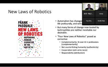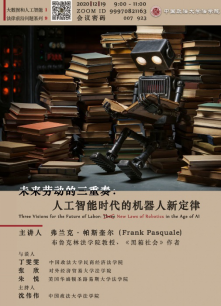 2020年12月19日上午,由新葡萄官网amg大数据和人工智能法律研究中心举办的“大数据和人工智能法律前沿问题”系列讲座第十九期,以线上会议的形式顺利举行。远在大洋彼岸的布鲁克林新葡萄官网amg弗兰克·帕斯奎尔教授,为师生带来了一场题为“未来劳动的三重奏:人工智能时代的机器人新定律”(Three Visions for the Future of Labor: New Laws of Robotics in the Age of AI)的精彩讲座。对外经贸大学新葡萄官网amg张欣老师和美国华盛顿圣路易斯大学新葡萄官网amg朱悦博士作为与谈嘉宾,与七十几位师生一同参与了本次讲座。研究中心主任沈伟伟老师担任主持本次讲座。
