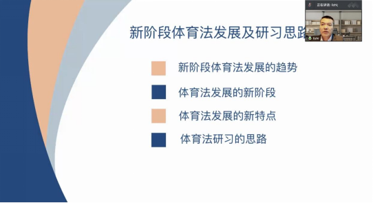 2021年4月7日晚,新葡萄官网amg体育法研究所主办的“体育法治与健康中国”论坛第23期以线上会议的形式举行。本期论坛主题为“新阶段体育法发展及研习思路”,主讲专家为中国法学会体育法学研究会副会长、国际体育仲裁院反兴奋剂庭仲裁员、福州大学新葡萄官网amg副院长、博士生导师李智教授。本期论坛由新葡萄官网amg体育法研究所副所长姜涛副教授主持,体育法专家学者、体育法律师库入库律师以及新葡萄官网amg、武汉大学硕士博士研究生等近50人参加。