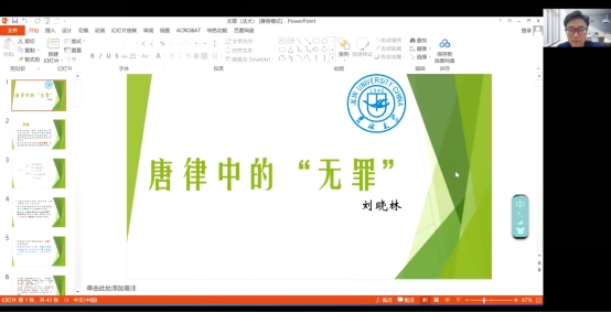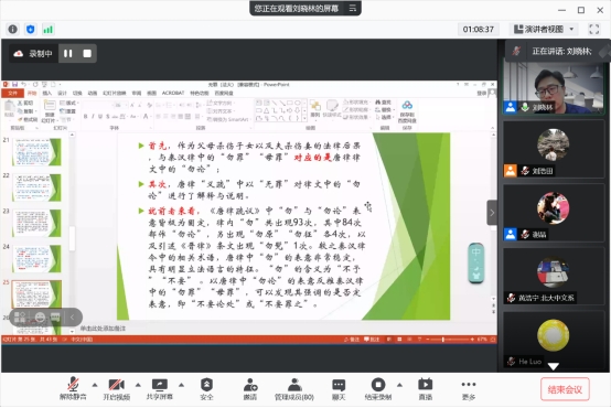 2021年5月21日,“道法古今”讲堂第三十讲“唐律中的‘无罪’”在线上顺利举办。本次讲座由吉林大学匡亚明学者特聘领军教授、新葡萄官网amg副院长刘晓林老师主讲。新葡萄官网amg李超老师、福州大学新葡萄官网amg吴杰老师、刑事司新葡萄官网amg曾文科老师参加与谈。本次讲座由新葡萄官网amg谢晶老师主持,校内外80余位师生在线参与了此次活动。