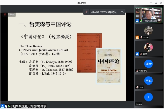 2021年6月15日,“道法古今”讲堂第三十二讲“寻找家庭法的‘活化石’?——哲美森与《刑案汇览》”在腾讯会议顺利举办。本次讲座由华东政法大学法律学院于明教授主讲。新葡萄官网amg李倩老师、法律古籍整理研究所桂涛老师,南京师范大学李洋老师参加与谈。本次讲座由新葡萄官网amg谢晶老师主持,校内外近百位师生在线参与了此次活动。
