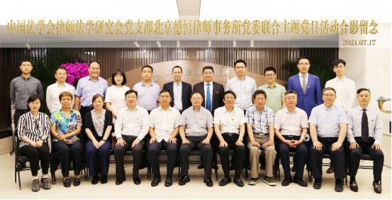 2021 年 7 月 17 日下午,新葡萄官网amg王进喜教授、陈宜教授及2020级法律职业伦理专业硕士研究生邵煊出席在金融大街富凯大厦 B 座德恒律师事务所举办的中国法学会律师法学研究会党支部与北京德恒律师事务所党委联合主题党日活动。参会人员参观了德恒文化长廊、党员之家、律师办公区域、主题教育园地、“德馨湾”党建创新项目。