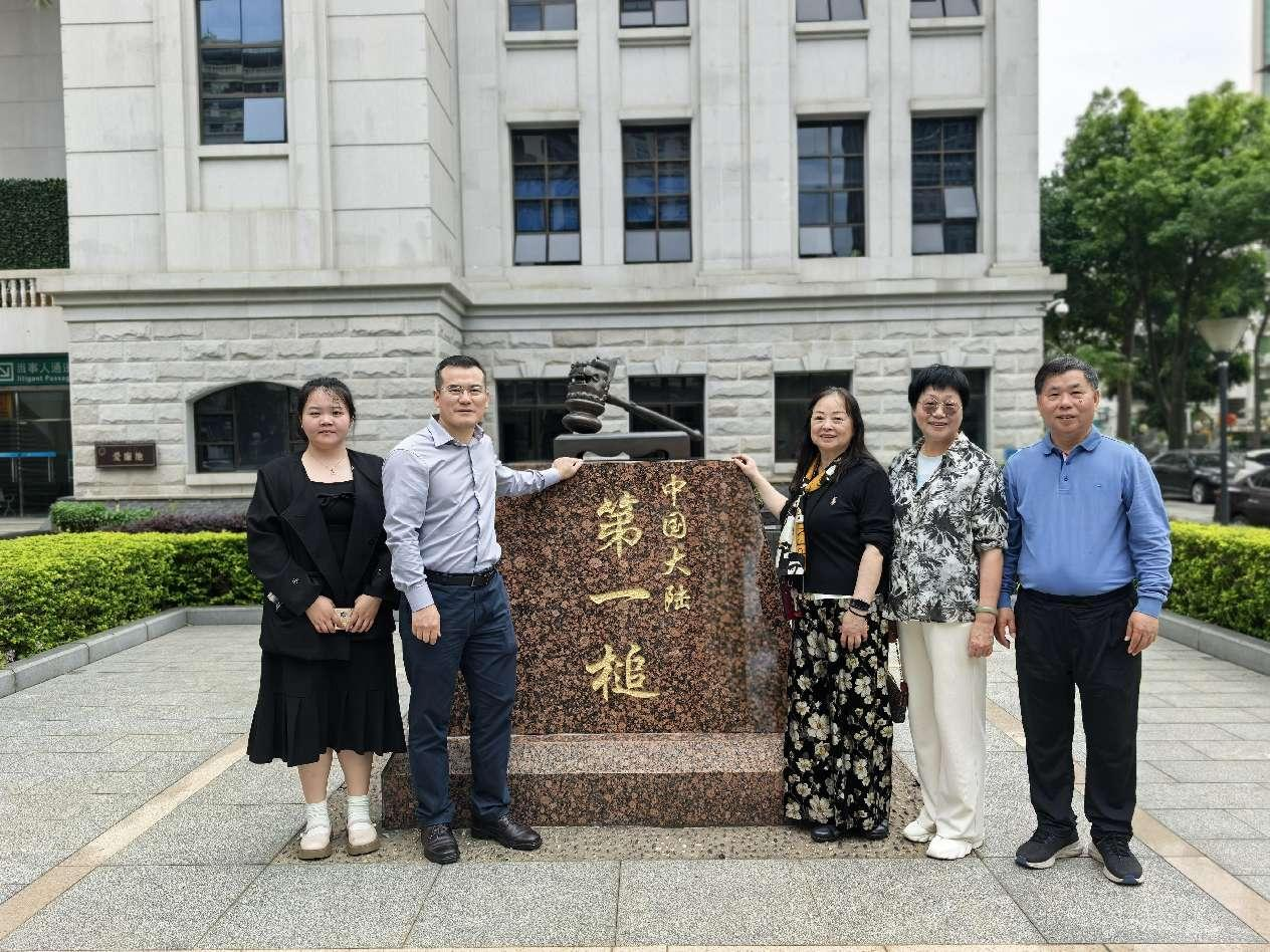 抵达思明法院后,团队成员首先参观了具有特殊历史意义的 中国大陆第一槌并一齐合影留念2001914日,思明区法院时任院长在审理刑事案件时敲响此槌。它由花梨木雕刻獬豸兽头,手柄有麦穗和齿轮雕饰。思明区法院敲响的第一槌很快引起了最高人民法院的注意。2002年法槌在全国法院统一使用,第一槌现藏于中国法院博物馆,它是我国审判形式改革的标志性见证,彰显着司法工作对公正与效率的追求。