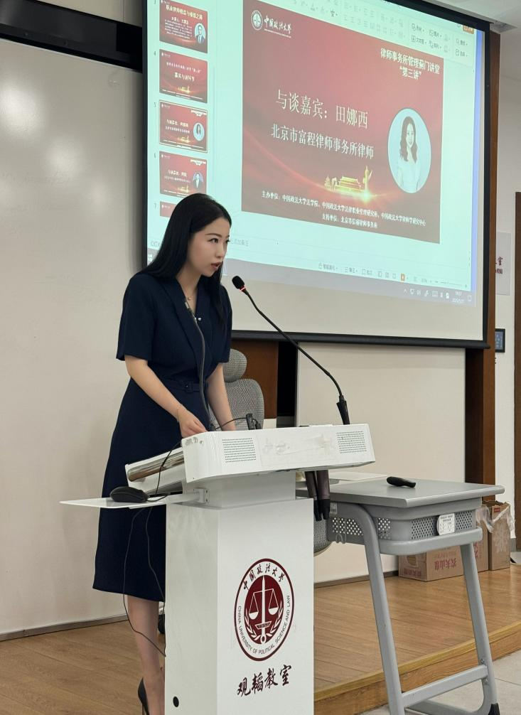 中国政法大学法学院法律职业伦理研究所副所长、副教授白冰对会议进行总结。白教授首先感谢与会嘉宾对研究所系列活动的支持,并重点分享了两点体会:一是强调中国律师制度发展40多年来面临的现实问题,特别是律所的规模化发展规律和国际化路径值得深入研究;二是提出律师职业修炼的“内外双修”之道,既要向内审视自我发展规划,又要向外学习他人经验。白教授通过生动案例,如参会着装礼仪、行业会议学习等细节,说明职业素养养成的重要性,他特别指出当前律师行业存在“埋头走路不抬头看”的现象,呼吁从业者既要专注业务,也要拓宽视野。最后,白老师再次感谢嘉宾和各位老师出席参与此次活动,也希望同学们在此次活动中收获宝贵的知识和经验,为推动律师事务所管理的科学发展和社会主义法治的进步贡献力量。