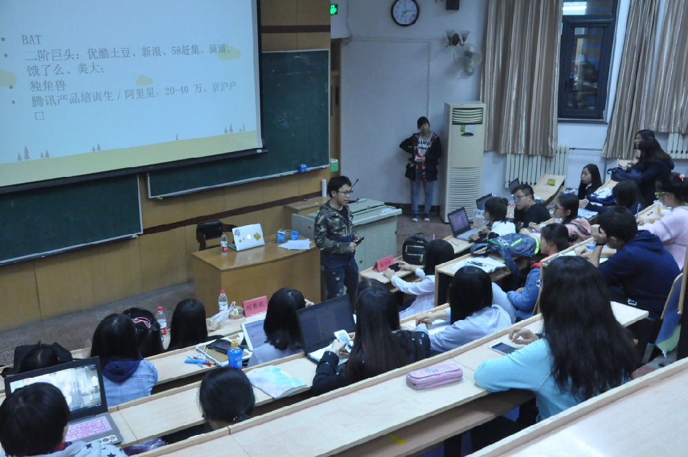 会议伊始,刘思毅先生做了一段简短的自我介绍,随后便直接进入了本次宣讲会的正题——同学们在求职过程中可能面对的问题,以及解决这些问题的方法。首先,他指出了高校毕业生在毕业求职时最大的问题就是没有明确的求职目标,不知道自己的就业优势和期望。因此,他用生活实例一一为同学们介绍了现在几个炙手可热的行业:互联网行业、快速消费行业、“四大”(四大会计师事务所)、“投行”(投资银行)和PEVC(投资人)的主要工作方向、员工素质要求和就职待遇等各方面的大致情况,为同学们将来选择求职公司指明了方向。