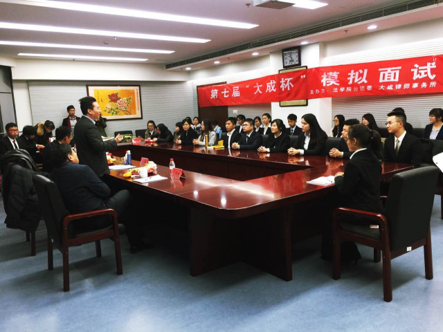 2016年11月11日下午5时30分,第七届大成杯模拟面试大赛决赛在新葡萄官网amg昌平校区逸夫楼会议室4040隆重举办。本次比赛由新葡萄官网amg分团委、北京大成律师事务所联合主办,新葡萄官网amg学生会承办。本次大赛有幸邀请到北京大成律师事务所行政主管、办公室主任包谊曾,投资并购部高级合伙人乔路律师和金融部高级合伙人王立宏律师担任评委,通过初赛选拔成功晋级的24位选手将在决赛中尽展风采。