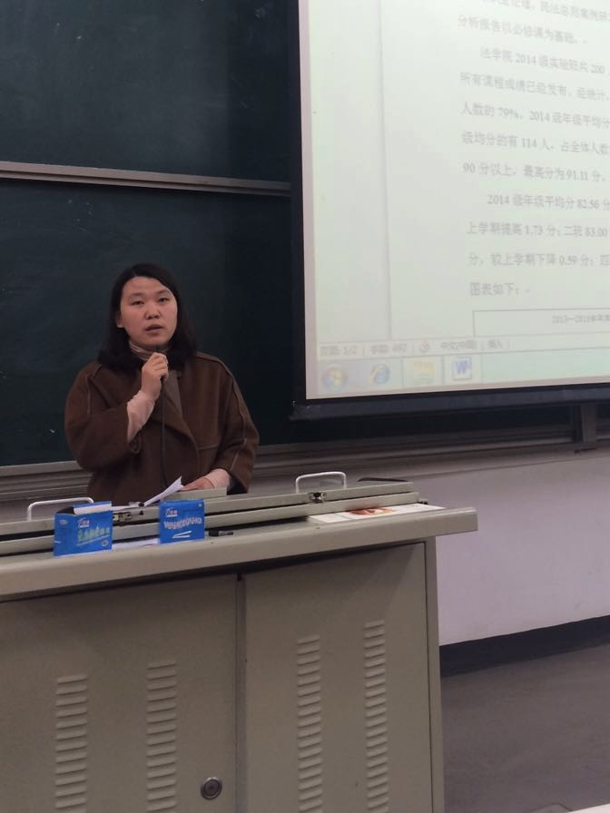 大会伊始,岳红池老师首先向同学们通报了2015-2016年度第一学期各班的成绩分析报告,并帮助同学们详细分析了不足之处,就如何提高学习成绩、营造良好的学习氛围等问题提出了切实的解决措施和方案。岳老师表示,年级整体学风建设良好,较第一学年成绩有所提高。她鼓励同学们要再接再厉,努力拼搏,争取在本学期再创辉煌。随后,岳老师分析了09级法学实验班毕业生的就业形势,详细地向同学们展现了每一位毕业生的就业去向。岳老师还为同学们一一分析和介绍了各类法律职业的利弊和就业风险,使同学们对于日后的就业问题有了初步的了解和规划。