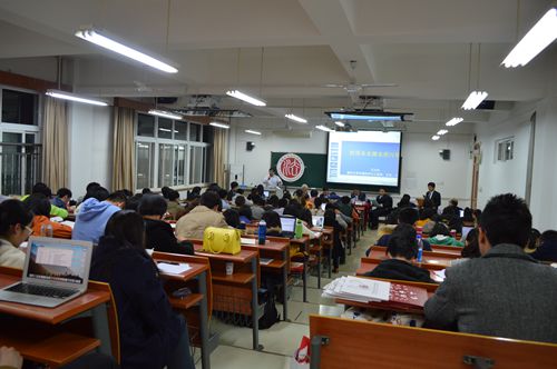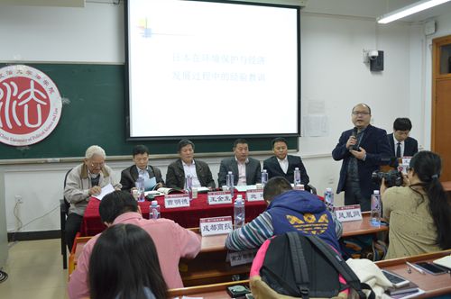 王占生首先为同学们展示了日本在经济发展过程中对待环保的态度,并指出我们从日本的发展中可以得到启示,比如公众的广泛参与和意见表达是环境治理的有效保障、环境保护要重视市场经济的作用等,此外他还着重介绍了饮用水水源水质污染的相关情况以及水污染带来的危害。接下来曹明德为大家阐释了新环保法的十大亮点,通过对十大亮点的逐一解读,他指出新环保法绝不是“棉花棒”而是“杀手锏”。紧接着王金生介绍了目前我国水资源的状况,指出水资源短缺且污染状况十分突出,并强调水污染的防治企业和媒体的责任重大。刘树明则立足于农业和农村,指出农村水污染的主要来源是农药、花费等的过量使用以及畜禽养殖,他还提到新环保法的出台是农村建立环保基础设施的有利时机,同时在环境优势地区大力推广有机农业、关闭不合格的化肥企业并由国家统一监管等措施是有效控制农村水污染的有效措施。