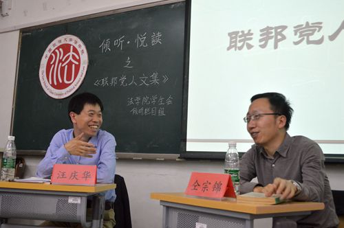 2015年4月24日晚,由新葡萄官网amg分团委主办、新葡萄官网amg学生会承办的《联邦党人文集》读书会成功举办。读书会邀请到了新葡萄官网amg教授汪庆华老师和新葡萄官网amg副教授仝宗锦老师与同学们交流《联邦党人文集》这本著作,剖析联邦党人与美国宪法制定的历史渊源。