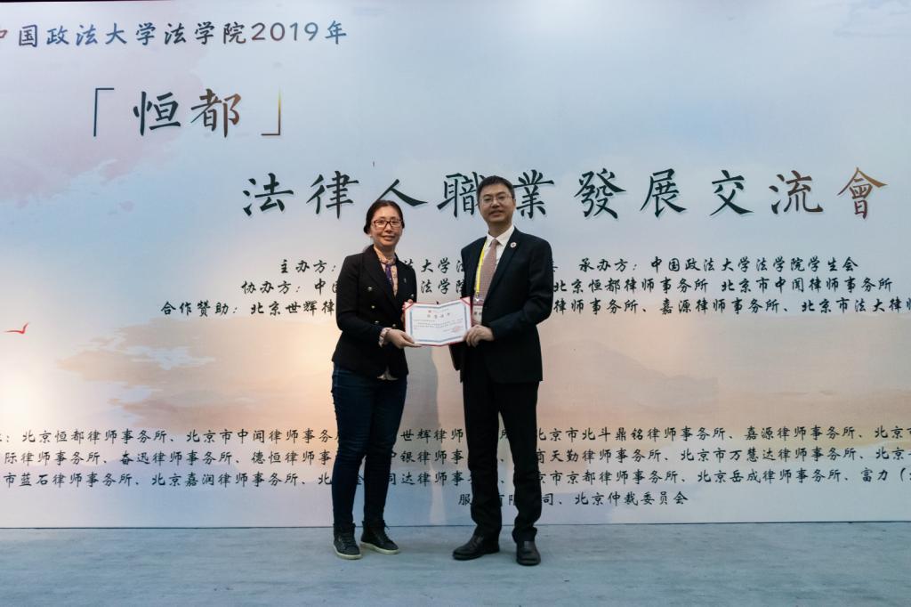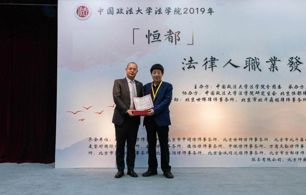在随后的赠礼仪式上,新葡萄官网amg分党委书记刘大炜老师和新葡萄官网amg分团委书记杨婷婷老师分别向赞助商北京恒都律师事务所和北京市中闻律师事务所的代表赠送精美礼品并合影留念。