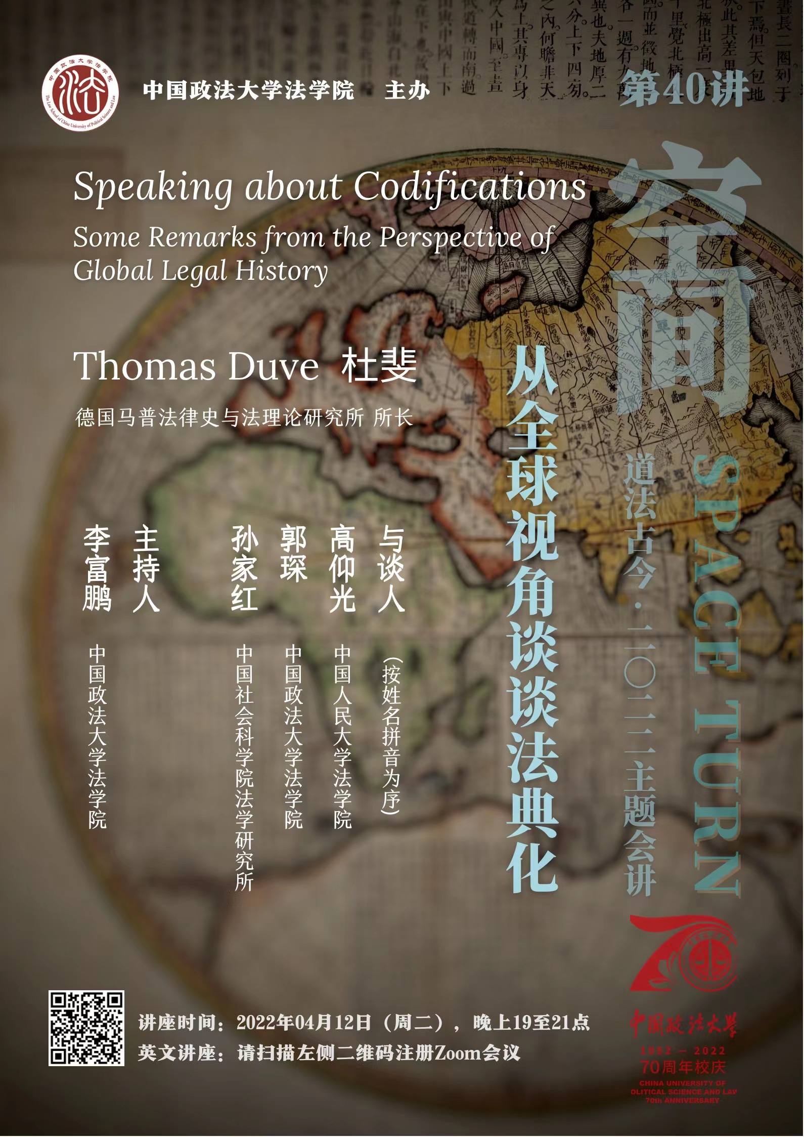 本讲座将展现一位德国法律史学家如何尝试理解全球化时代的法律知识交流的历史进程。通过将法典化置于全球视角之下,Thomas Duve教授在一个简短概述之后(I),将对19世纪和20世纪的法律与法学的全球化历史做一些补充说明(II)。此外,他将展现像中国民法法典化这样一个与跨国知识交流密切相关的复杂过程的传统分析方式(III)。最后,他将重点介绍为什么他认为将这些现象理解为通过“文化转译”(cultural translation)生产规范性知识的过程会有帮助(IV)。作为这项研究的一部分,在马克斯-普朗克法律史与法理论研究所,我们正在逐渐形成一些方法和视角。我们希望这些方法和视角能够帮助更好地理解当前法律与法学的全球化和地方化——我们有时会说“全球地方化”(glocalization)。因为我们相信,法律史必须在过去的基础上开展工作,但也要为更好地理解和定位现在而服务。