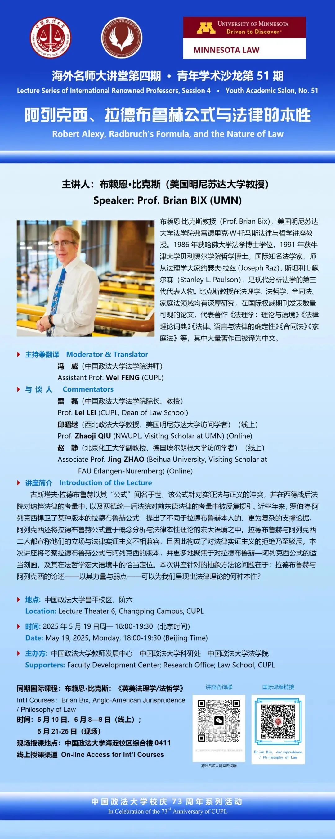 讲座简介:古斯塔夫·拉德布鲁赫以其“公式”闻名于世,该公式针对实证法与正义的冲突,并在西德战后法院对纳粹法律的考量中,以及两德统一后法院对前东德法律的考量中被反复援引。近些年来,罗伯特·阿列克西捍卫了某种版本的拉德布鲁赫公式,提出了不同于拉德布鲁赫本人的、更为复杂的支撑论据。阿列克西还将拉德布鲁赫公式置于概念分析与法律本性理论的宏大语境之中。拉德布鲁赫与阿列克西二人都宣称他们的立场与法律实证主义不相兼容,且因此构成了对法律实证主义的拒绝乃至驳斥。本次讲座将考察拉德布鲁赫公式与阿列克西的版本,并更多地聚焦于对拉德布鲁赫—阿列克西公式的适当刻画,及其在法哲学宏大语境中的恰当定位。本次讲座针对的抽象方法论问题在于:拉德布鲁赫与阿列克西的论述——以其力量与弱点——可以为我们呈现出法律理论的何种本性?