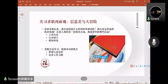 新葡萄官网amg学生代表赵宇轩和华心怡则从自身经历出发,向同学们分享了自己的实习经验。赵宇轩以自己在最高人民法院和北京中伦律师事务所的实习经历为例,建议同学们尽可能多尝试不同类别的实习,体验不同的职业选择。实习时完成工作任务与学校中完成社团任务有共通之处,建议实习时努力提高工作能力,注重细节和态度,多听、多看、多学习、勇敢说。华心怡为大家分享如何多渠道获取求职信息,建议同学们在实习中主动积累行业知识,有意识地反思总结,不断提升自己。同时介绍了异地实习需要注意的相关事项,建议同学们实习的目的是了解各个业务,明确自己想要努力的方向,找到不足,不断进步。