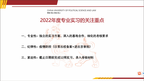 随后,2018级本科生辅导员孙毅老师为大家介绍2022年度专业实习的关注重点。对院内集中安排实习的情况做了大致汇总,着重强调了专业实习的专业性、纪律性、紧迫性,希望引起大家的重视。