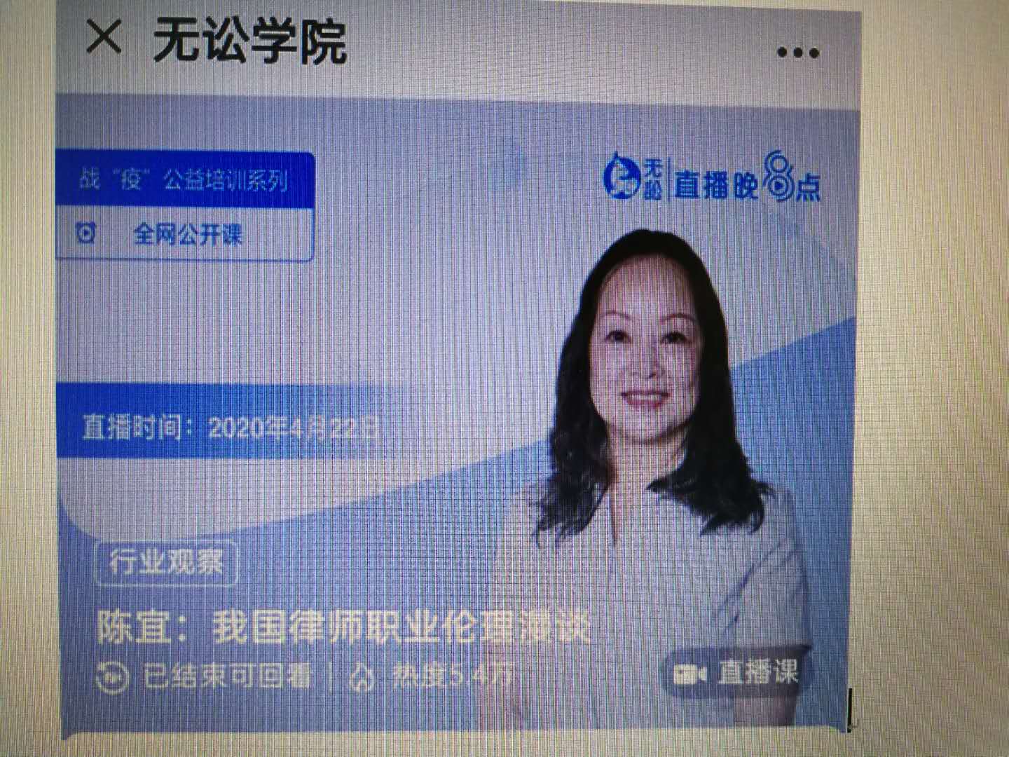 2020年4月22日晚,我院陈宜教授应无讼学院邀请,做了一场《我国律师职业伦理漫谈》的公益直播讲座。陈宜教授从律师职业伦理与职业责任、我国律师职业伦理的前世今生、我国律师职业伦理存在的问题、两结合管理体制下的律师职业伦理建设、我国律师职业伦理展望等方面,分享了自己的心得并与学员互动,2万余人在线,获参会者好评。