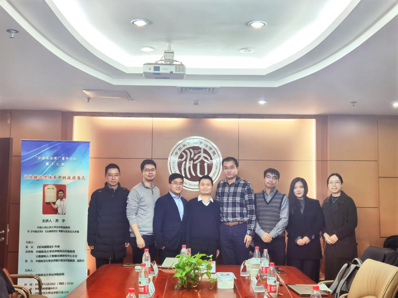 2020年11月26日晚,由新葡萄官网amg行政法研究所主办的第19期“公法与治理”青年论坛在新葡萄官网amg研究生院科研楼A913会议室圆满举行。本次论坛由新葡萄官网amg行政法所胡斌老师主持,主讲嘉宾为中国人民公安大学新葡萄官网amg副教授、中国人民公安大学数据法学研究院院长苏宇副教授,论坛主题为“区块链治理体系中的政府角色”。出席讲座和参与与谈的嘉宾包括《区块链简史》作者吴云先生,新葡萄官网amg宪法所沈伟伟副教授、新葡萄官网amg行政法所赵宏教授和张力副教授、新葡萄官网amg法治政府研究院王春蕾老师、中国人民大学教育学白紫薇博士。此外,还有十余名博士和硕士研究生聆听了此次讲座。
