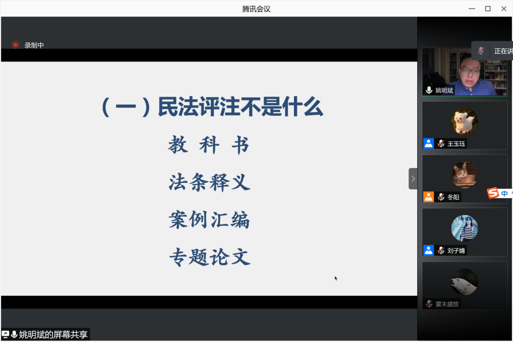 姚明斌副教授以“民法评注本土化”为题,从规范、学说和审判实践三个层面分析了民法评注的使命,指出民法评注具有促进后法典时代多元法源发展、促使学说通说形成和加快裁判实践系统整合等功能。姚明斌副教授总结了民法法律评注的写作要点,指出了评注面向实务人士和法科学生等阅读人群,应使用通俗的概念术语,文风当兼顾精准与通俗。最后,他提出法律评注要兼顾案例运用、规范适用、实务学理和本土问题,运用整理型、支撑型、批判型、问题型等多种法律评注形态促进民法评注的本土化发展。