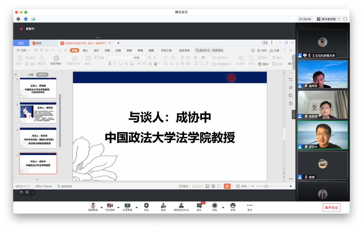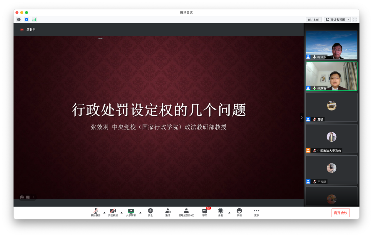 2021年2月2日晚七点,由新葡萄官网amg行政法研究所主办的 “《行政处罚法》修订系列讲座”第一期通过腾讯会议顺利举办。本次讲座的主题是“行政处罚设定的新发展”,主讲人是新葡萄官网amg法治政府研究院教授杨伟东。本次讲座由新葡萄官网amg罗智敏教授主持, 中共中央党校(国家行政学院)政治和法律教研部张效羽教授和新葡萄官网amg成协中教授参加与谈,此外中南财经政法大学方世荣教授、南开大学新葡萄官网amg宋华琳教授、新葡萄官网amg法治政府研究院院长赵鹏教授以及新葡萄官网amg行政法研究所王建芹教授、赵宏教授、蔡乐渭副教授、马允副教授、张冬阳博士、胡斌博士等来自国内外高校的六百余名老师和学生在线上聆听了此次讲座。