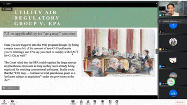 杨欣博士首先从美国《清洁空气法》的相关规定出发,介绍了美国环境法的历史及《清洁空气法》所规定的监管标准和监管项目,如标准污染物的环境空气质量标准(NAAQS)及相应的各州实施计划(SIP)、新污染源审查(New source review)、未达标区(NA)和禁止严重恶化项目(PSD)等;随后,杨欣博士介绍了奥马巴执政期间就汽车移动污染源规制在各利益相关方间达成的协议(Car Deal),并详细介绍了Massachusetts v. EPA,Utility Air Regulatory Group v. EPA案等温室气体规制案例。最后结合拜登政府上台后针对温室气体规制所采取的一系列举措,向听众全面展示了因政权更迭而产生的美国温室气体规制的多米诺骨牌效应。