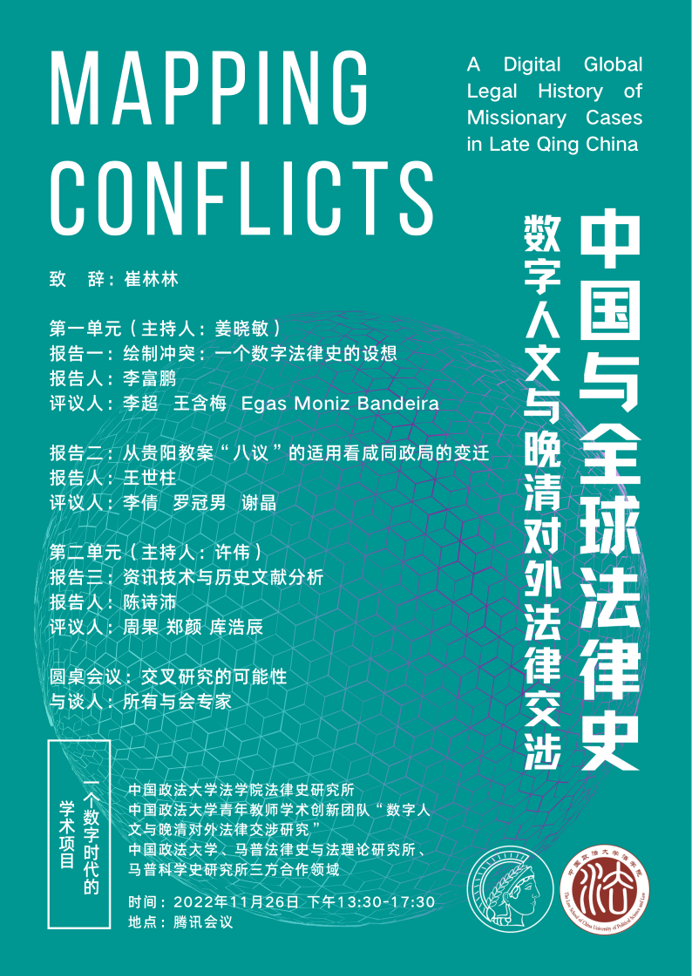 2022年11月26日,“中国与全球法律史:数字人文与晚清对外法律交涉”国际研讨会顺利举办。本次活动由新葡萄官网amg法律史研究所、新葡萄官网amg“数字人文与晚清对外法律交涉研究创新团队”主办,来自德国马普科学史研究所、德国马普法律史与法理论研究所、德国埃朗根-纽伦堡大学、中国人民大学、华中师范大学、新葡萄官网amg等高校和研究机构的15位学者通过线上方式,进行了学术会谈与交流。本次会议分为“法律史与晚清对外法律交涉”、“数字人文的技术应用”两单元进行。