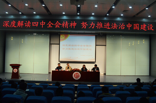 党的十八届四中全会以依法治国为主题,吹响了建设社会主义法治国家的号角,为动员全院师生深入学习贯彻宣传全会精神,深刻领会全面推进执法治国的重大意义、根本要求、正确方向和重大任务,坚定不移走社会主义法治道路,2014年10月28日下午,新葡萄官网amg分党委在昌平校区逸夫楼刘皇发报告厅举行了以“深度解读四中全会精神,努力推进法治中国建设”为主题的专题报告会。新葡萄官网amg院长薛刚凌、副院长焦洪昌、法理学研究所蒋立山教授作为主报告人,分别从宪法学、法理学和行政法学角度解读十八届四中全会关于全面推进依法治国的重点内容。青年教师袁钢担任报告会主持人。新葡萄官网amg领导班子、各教研室教师、全体本科生党员与入党积极分子参加本次报告会。