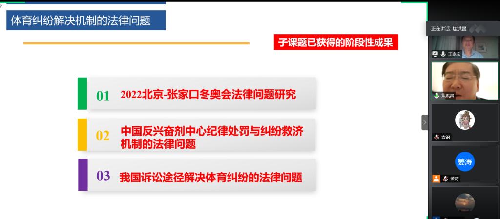 2020年5月20日晚19点至21点,由新葡萄官网amg体育法研究所主办的“体育法治与健康中国”论坛第十八期通过腾讯会议的形式在线上举行。本期学术论坛邀请到苏州大学王家宏教授主讲,主题是“中国体育深化改革的法律研究综述”。讲座由马宏俊教授主持,新葡萄官网amg院长焦洪昌教授、体育法研究所所长马宏俊教授、王小平教授、张笑世教授、袁钢教授、姜涛副教授、邓建新副教授以及来自新葡萄官网amg、苏州大学的体育法学、体育学专业的博硕士研究生参加了本次讲座。