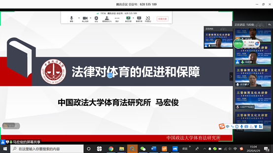 2020年6月29日,新葡萄官网amg体育法研究所所长马宏俊教授受山西省体育局邀请,作了题为“法律对体育的促进与保障”的公开讲座,这也是山西省体育局所办的“三晋体育文化大讲堂”第二十期。“三晋体育文化大讲堂”是为了加强山西体育文化建设,由省体育局举办的系列讲座活动。受疫情影响,本次讲座在线上举办,由网易山西和搜狐千帆同步直播。