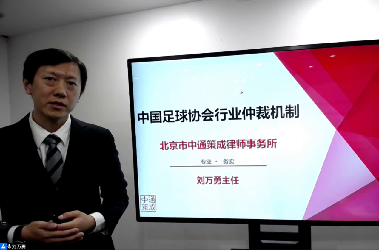 2020年11月3日晚19至21点,由新葡萄官网amg体育法研究所主办的“体育法治与健康中国”论坛第二十期通过腾讯会议的形式在线上举行。本期学术论坛由北京市中通策成律师事务所主任、中国足协仲裁委员会副主任刘万勇律师主讲,主题是“中国足球协会行业仲裁机制”。论坛由马宏俊教授主持,姜涛副教授点评。来自全国各地的体育法同行、体育法律师库部分入库律师以及新葡萄官网amg体育法硕士研究生参加了本次论坛。