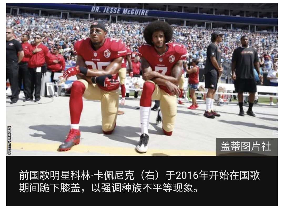 在美国,美国国家橄榄球联盟(NFL)曾表示,应允许球员在国歌中抗议,美国足球也推翻了禁止球员在国歌中下跪的禁令。