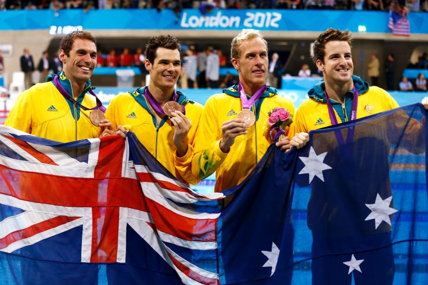 在2012年伦敦奥运会男子4x100米混合泳接力决赛后,澳大利亚选手(从左到右) Matt Targett, Christian Sprenger, Hayden Stoeckel and James Magnussen 与他们的铜牌合影。(路透社: Michael Dalder)