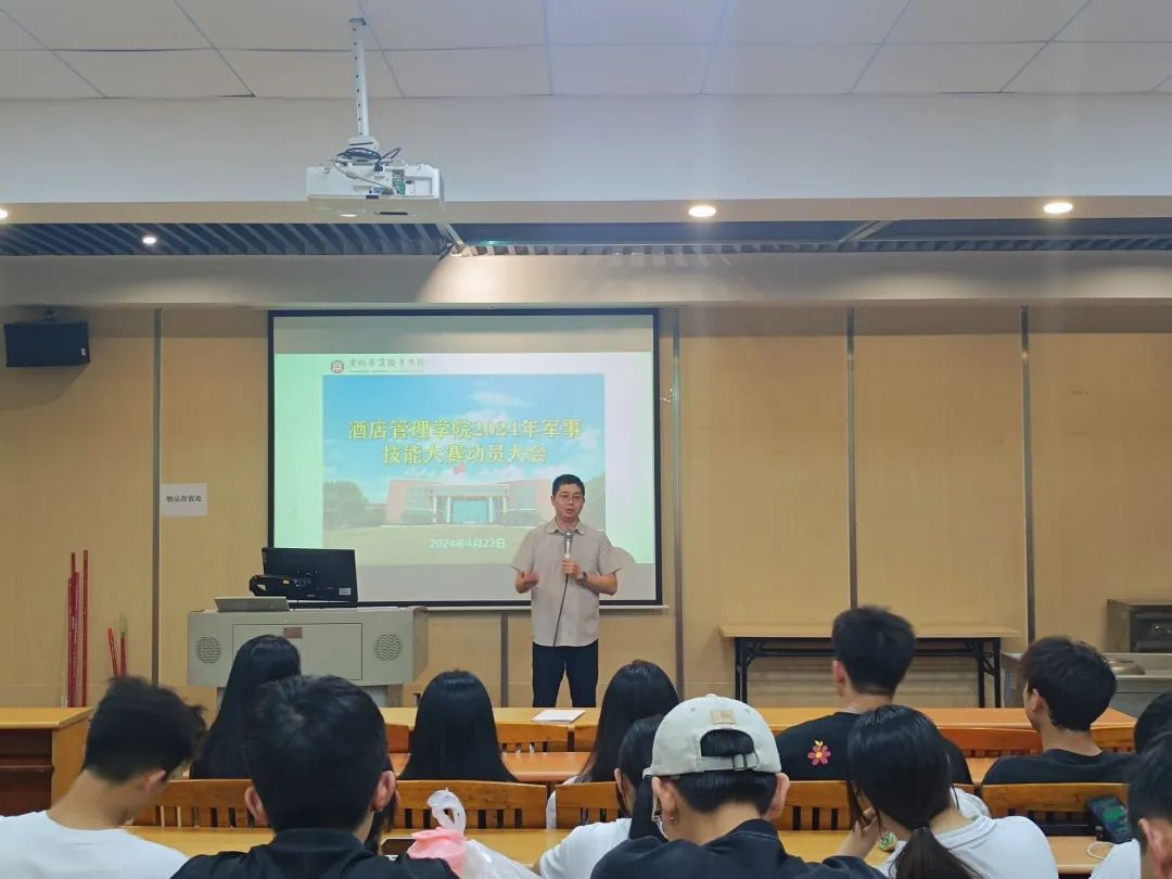 4月22日,酒店管理学院在创教101举行了2024年军事技能大赛的动员大会。此次大会旨在鼓舞士气,确保即将到来的军事技能大赛顺利进行。谢锦权书记、辅导员陈海宁和全体参...